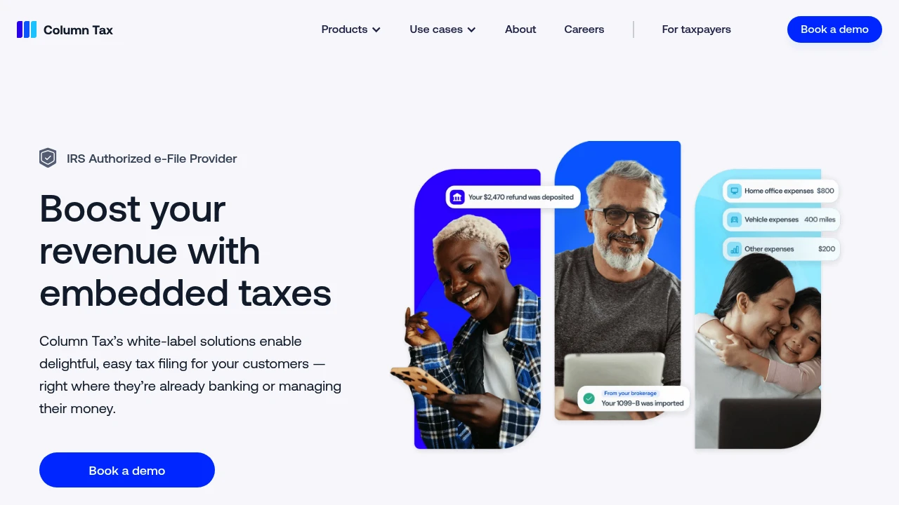 The Column Tax difference Tax products built for todays world. Column Tax is the first ever IRS authorized API-first tax filing product. We’ve built a best in class experience, offer a maximum refund and accuracy guarantee for your customers, and we’ll even handle customer support.